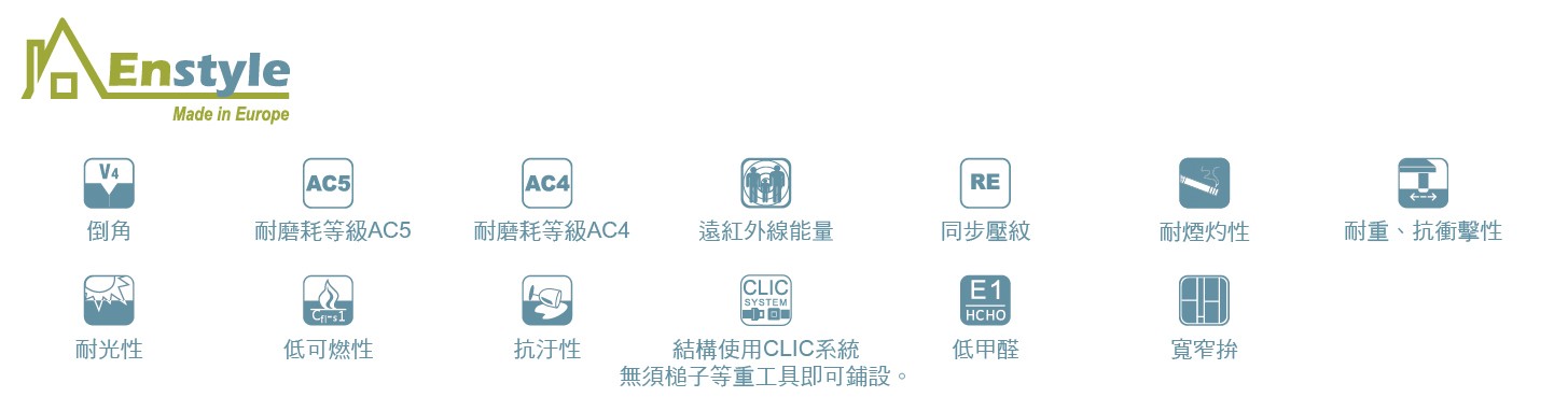 Enstyle以優質的耐磨層搭配環保HDF基材,延長強化地板的使用年限、降低退色與磨損狀況,各項指標符合歐洲環保標準,是集高品質、高耐用度與遠紅外線能量為一體的全球首創能量健康強化地板。